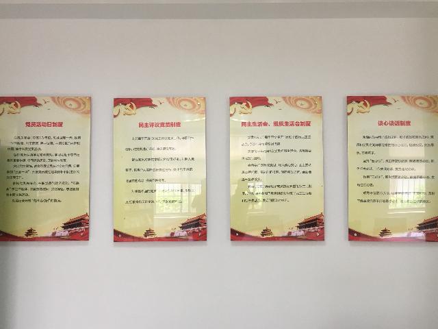 黨員活動室在醒目位置特設主題教育墻,包括黨旗、入黨誓詞、黨員義務和權利。活動室內有8個宣傳展版,內容包括組織架構圖、黨委委員崗位職責、紀委委員崗位職責、民主生活會組織生活會制度、“三會一課”制度、民主評議黨員制度、發展黨員工作流程圖和黨員活動日制度。活動室還配備了報刊書架,擺放黨員學習書刊雜志等。